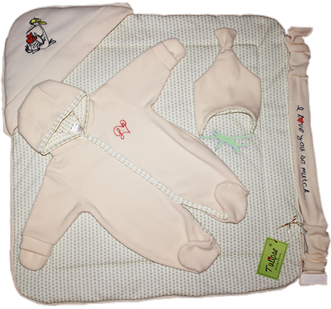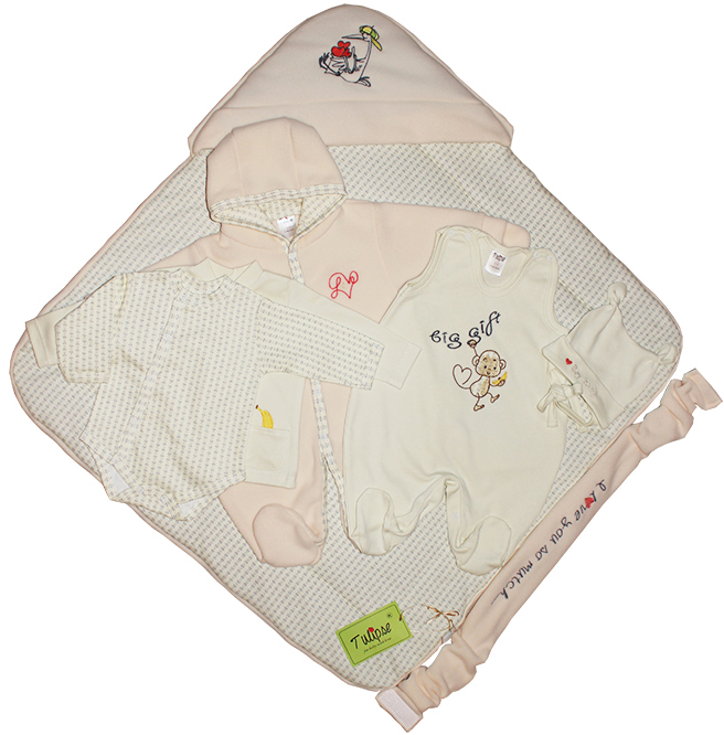 Состав: боди 100% хлопок, кофточка, шапочка и ползунки 100% хлопок велюр, комбинезон из флиса 100% п/э, конверт для новорожденного верх флис 100% п/э, подклад 100% хлопок интерлок, утеплитель натуральный подшерсток верблюжонка плотностью 250 г/м2.